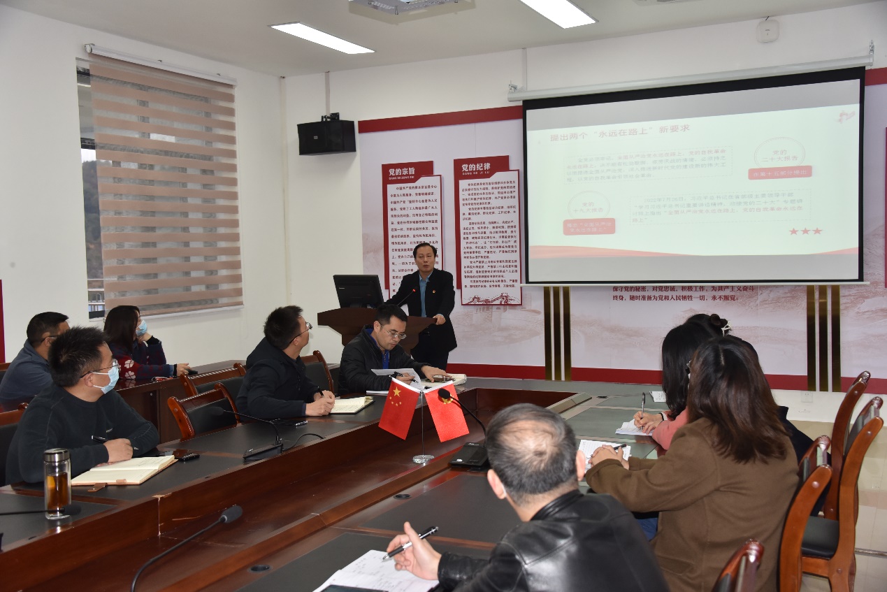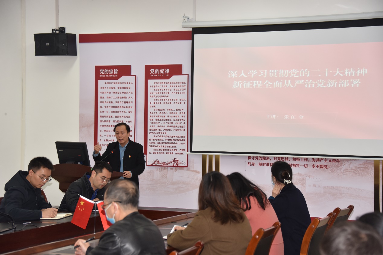 会上,张在金同志以《深入学习贯彻党的二十大精神 新征程全面从严治党新部署》为题讲授专题党课,带领同志们学习了习近平在中国共产党第二十次全国代表大会上的报告中的第十五部分 ——坚定不移全面从严治党,深入推进新时代党的建设新的伟大工程。张在金同志以中国共产党过去五年和新时代十年来所取得的成就为切入点,对深入推进新时代党的建设伟大工程中全面从严治党的具体要求和举措,以及推进新时代党的建设新的伟大工程中全面从严治党所提出的新要求、新思路、新观点和新举措等进行了全面的阐述。他强调,党的领导是全面的、系统的、整体的,必须全面、系统、整体加以落实,要坚持不懈用新时代中国特色社会主义思想凝心铸魂,要完善党的自我革命制度规范体系,要建设堪当民族复兴重任的高素质干部队伍,要增强党组织政治功能和组织功能,要坚持以严的基调强化正风肃纪,坚决打赢反腐败斗争攻坚战持久战。