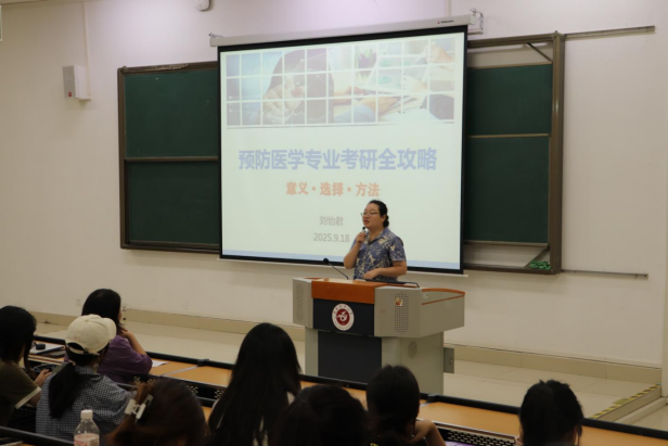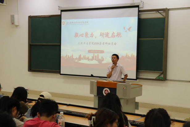 会议伊始,预防医学教研室主任刘怡君为同学们讲解考研的意义,结合专业及院校选择、备考策略等方面给大家提出建议,并分享个人经历激励大家积极准备。食品质量与安全专业负责人张孝刚鼓励同学们明确人生方向,无论是选择就业还是考研,都应早做规划;他建议同学们扎实学习、主动参与导师课题实验,不断提升专业素养和综合能力。随后,2025级流行病与卫生统计学专业研究生路敏结合自身在校本科学习经历,从考研或保研的决策、院校选择、复习方法到面试准备,全过程分享了备考经验与心得。师生代表的发言从不同角度全面而细致地为同学们解析了考研过程中可能遇到的各类问题,并提供了实用建议。