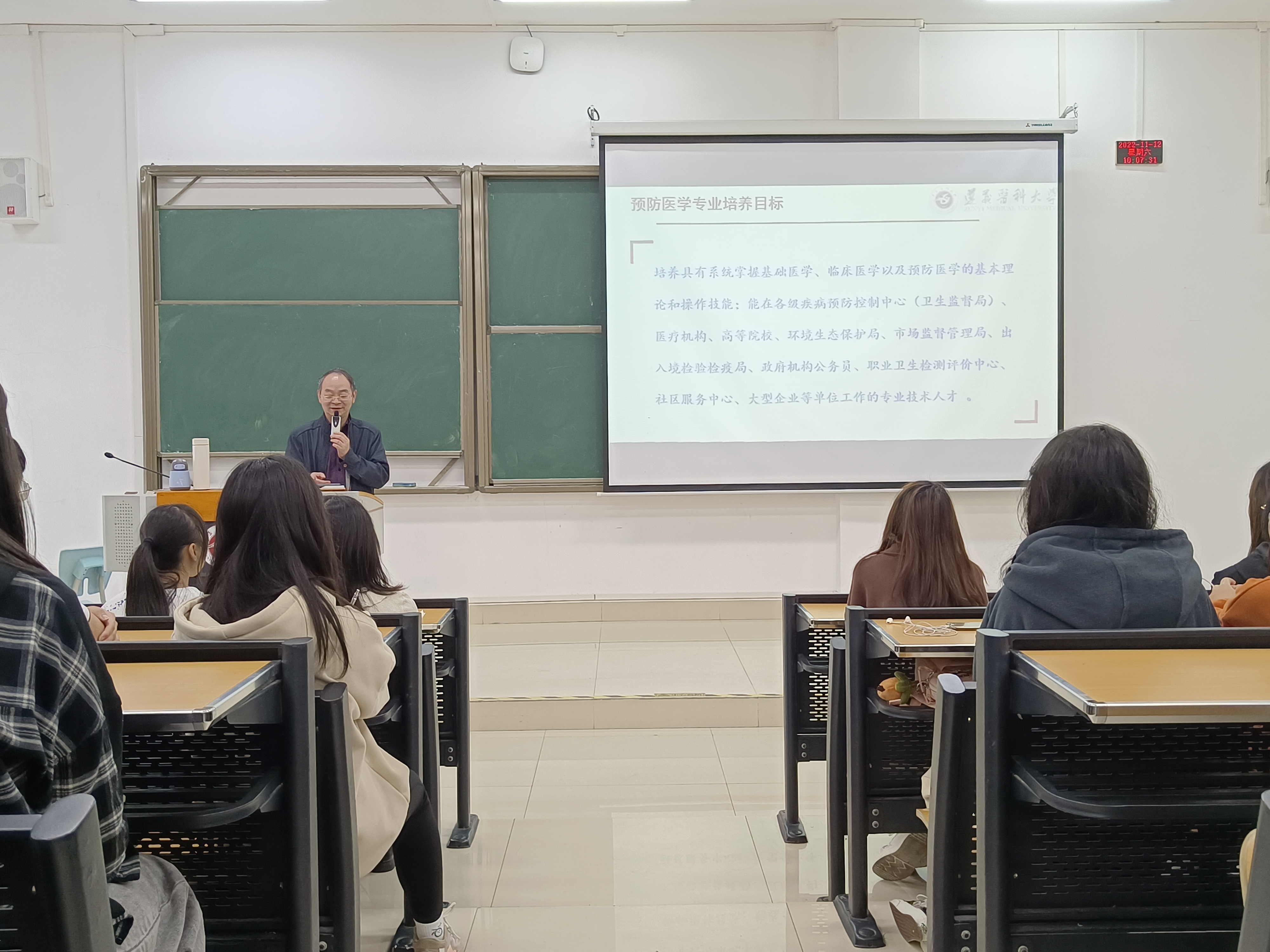 会议开始,陈青老师为大家介绍了本次会议的主题、流程及主讲人李岩院长。会上,为进一步加强学风建设,李院长向大家重点传达和强调了相关规定:即从11月14日起,2022级学生需在周一至周四19:00-21:30到指定自习室自习。紧接着,李岩教授针对学生提出的疑问,为大家解答了预防医学专业的培养目标、就业方向、就业率、实习、考研和目前医院、疾控待遇等方面的问题。李院长强调,同学们在五年的学习期间要有自己的人生规划,全面提高自身的综合素养,希望并鼓励学生们学好英语、积极考取研究生、积极参加公共卫生职业医师考试和技能大赛等。会议最后,李院长提出了对学生的几点期待,呼吁学生朝着更高的目标发展,迎接新的发展机遇。