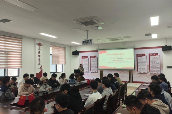 会议第二阶段,学院邀请武装部禹倩老师进行2024年征兵宣讲会。学院办公室杨应军(入伍转业人员)、全体学院辅导员及19预防、20食安、21食安应征入伍适龄同学共60余人参加会议。