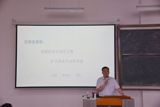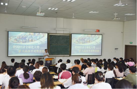 郭宇亮副书记以《把握经济全球化大势扩大高水平对外开放》为题,重点围绕不可阻挡的历史潮流、破解困局的中国方案、繁荣发展的必由之路等三个方面作了详细讲解。讲授过程中,他结合大量事例作了深入浅出的讲解。其中,他以“RCEP助力泰国香水椰开拓中国市场”为例阐述了经济全球化为世界经济作出的重要贡献。再以“经济全球化出现曲折”为切入点,阐释了“坚持开放、包容、合作、多边”的中国方案。最后重点讲解了要以开放纾发展之困、以开放汇合作之力、以开放聚创新之势、以开放谋共享之福。