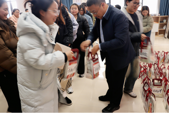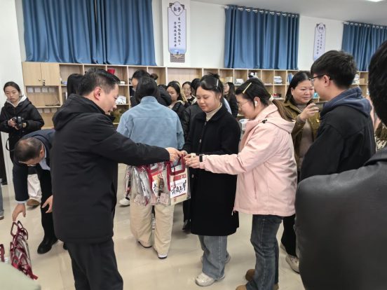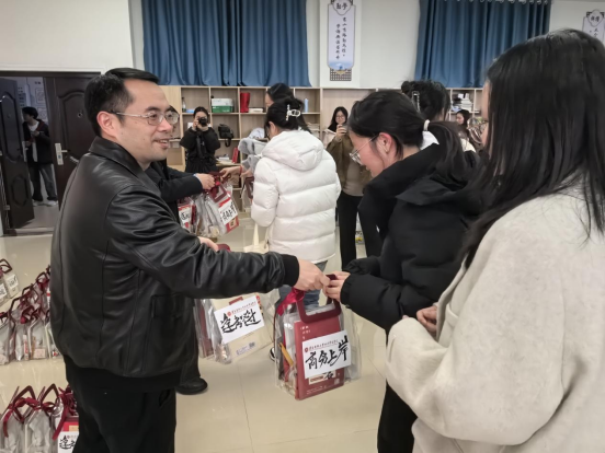 随后,学院领导为考研学子一一送上精心准备的“考研温暖加油包”。礼包外包装印有betway西汉姆联平台院徽与醒目的“高分上岸”祝福语,其中装有暖意融融的暖宝宝、舒缓疲劳的眼罩、随手可捏的解压捏捏乐、学院定制书签、寓意好运的精美挂件、书写顺遂的“上岸笔”、实用笔记本以及老师和学弟学妹们手写的祝福信等多样贴心物品。每一份礼物都凝聚着学院对同学们深切的关怀与真挚的鼓励。接过加油包的学子们倍感温暖,纷纷对学院的悉心安排表达了由衷的感谢。