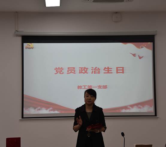 在为5月份入党的同志过“政治生日”阶段,支部书记刘俊为李岩、张在金、胡斌丽、张建玲四位同志赠送“政治生日贺卡”和纪念品;党员代表胡斌丽作“政治生日”交流发言。