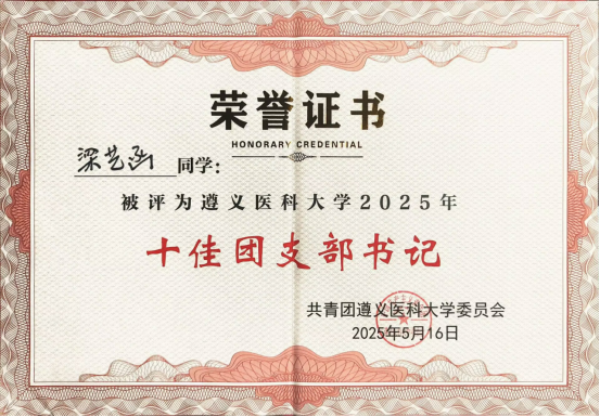 近日,在学校团委组织的“十佳团支部书记”评选活动中,我院预防医学22级1班团支书梁艺函脱颖而出,荣获betway西汉姆联“十佳团支部书记”。