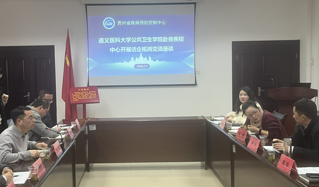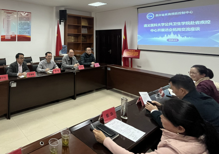 2月5日,为进一步深化校地协同、凝聚合作共识,助推公共卫生人才培养与毕业生高质量就业,学院副院长刘俊、石修权带队前往贵州省疾病预防控制中心(贵州省预防医学科学研究院)交流座谈。座谈会由贵州省预防医学科学研究院负责人陈刚主持。